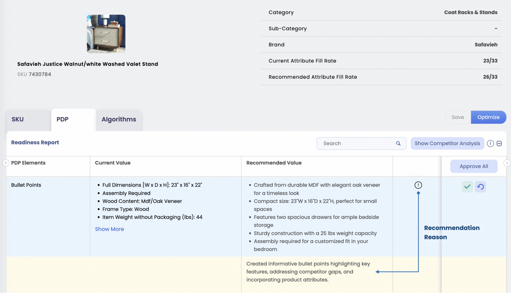 DataWeave’s Content Optimization solution analyzes existing PDP content to identify attribute gaps, inconsistencies, and content quality issues. It then provides actionable recommendations to improve accuracy, strengthen attribute coverage, and refine product messaging so listings are more complete, comparable, and optimized for conversion.