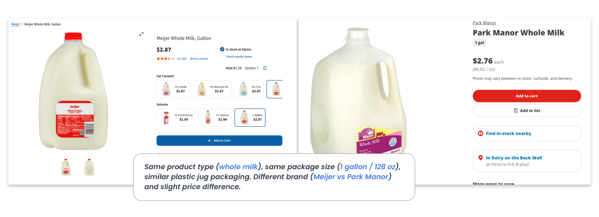 Explanation: Same product type (whole milk), same package size (1 gallon / 128 oz), similar plastic jug packaging. Different brand (Meijer vs Park Manor) and slight price difference.