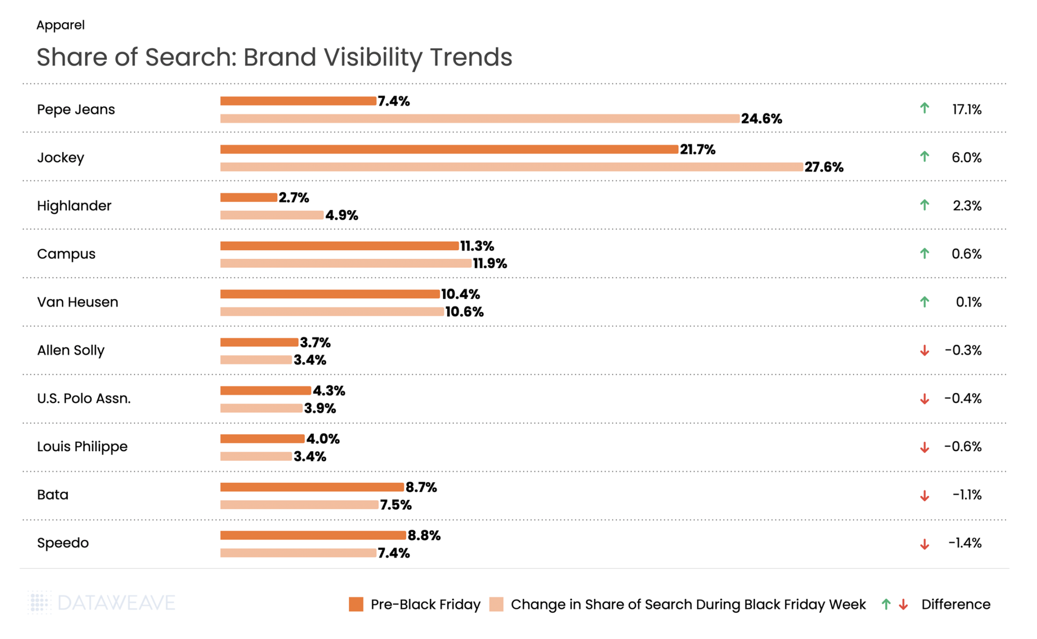 Pepe Jeans dominated visibility, surging from 7.4% to 24.6%, a staggering gain that represents the largest visibility increase across all categories. Jockey also performed strongly with a 6% gain, solidifying its position in innerwear.