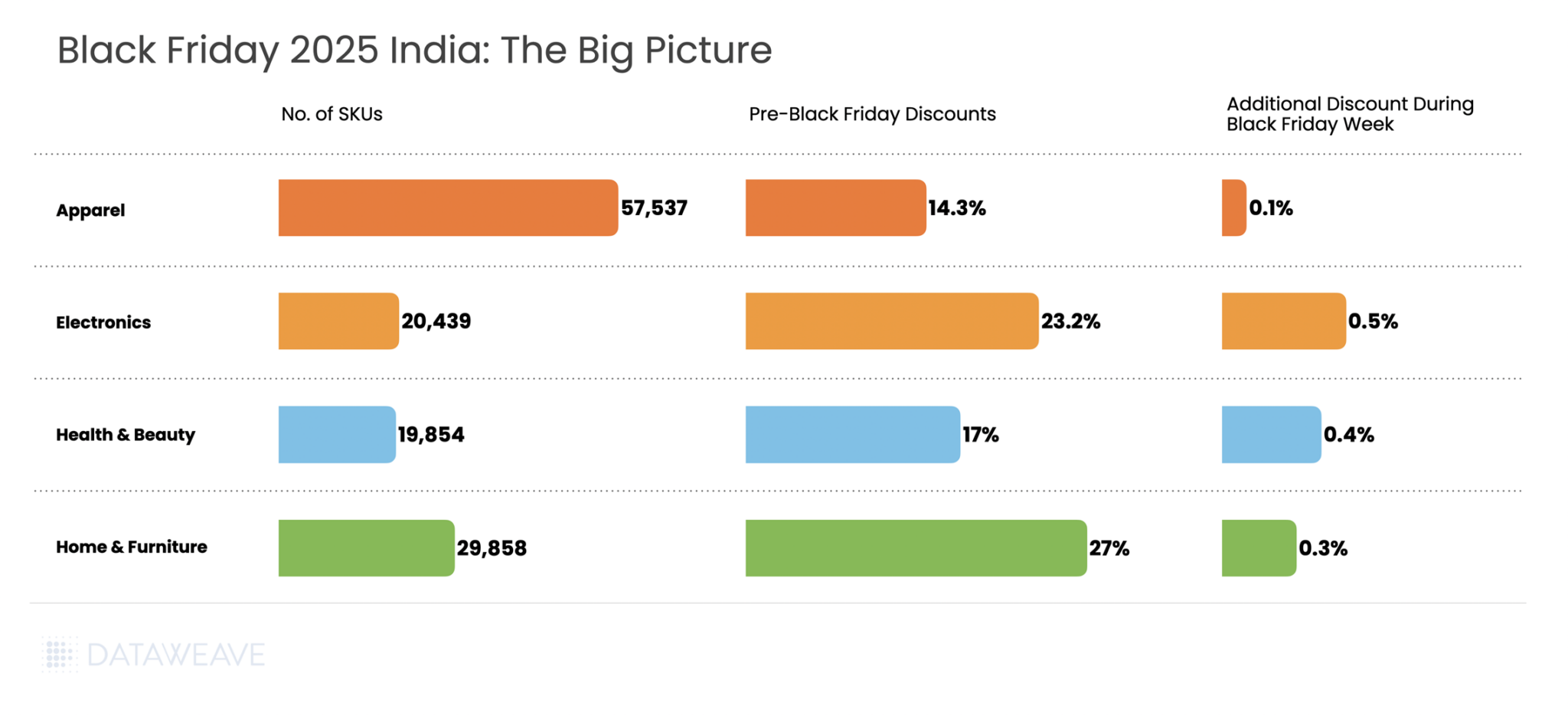 So how did Indian retailers and brands navigate Black Friday 2025? At DataWeave, we analyzed pricing trends across four major categories: Consumer Electronics, Home & Furniture, Health & Beauty, and Apparel. Our AI-powered retail intelligence platform tracked nearly 128,000 SKUs across leading platforms including Amazon India, Flipkart, Myntra, and others, revealing how the Indian market approached discounting and brand visibility during this high-stakes shopping period.