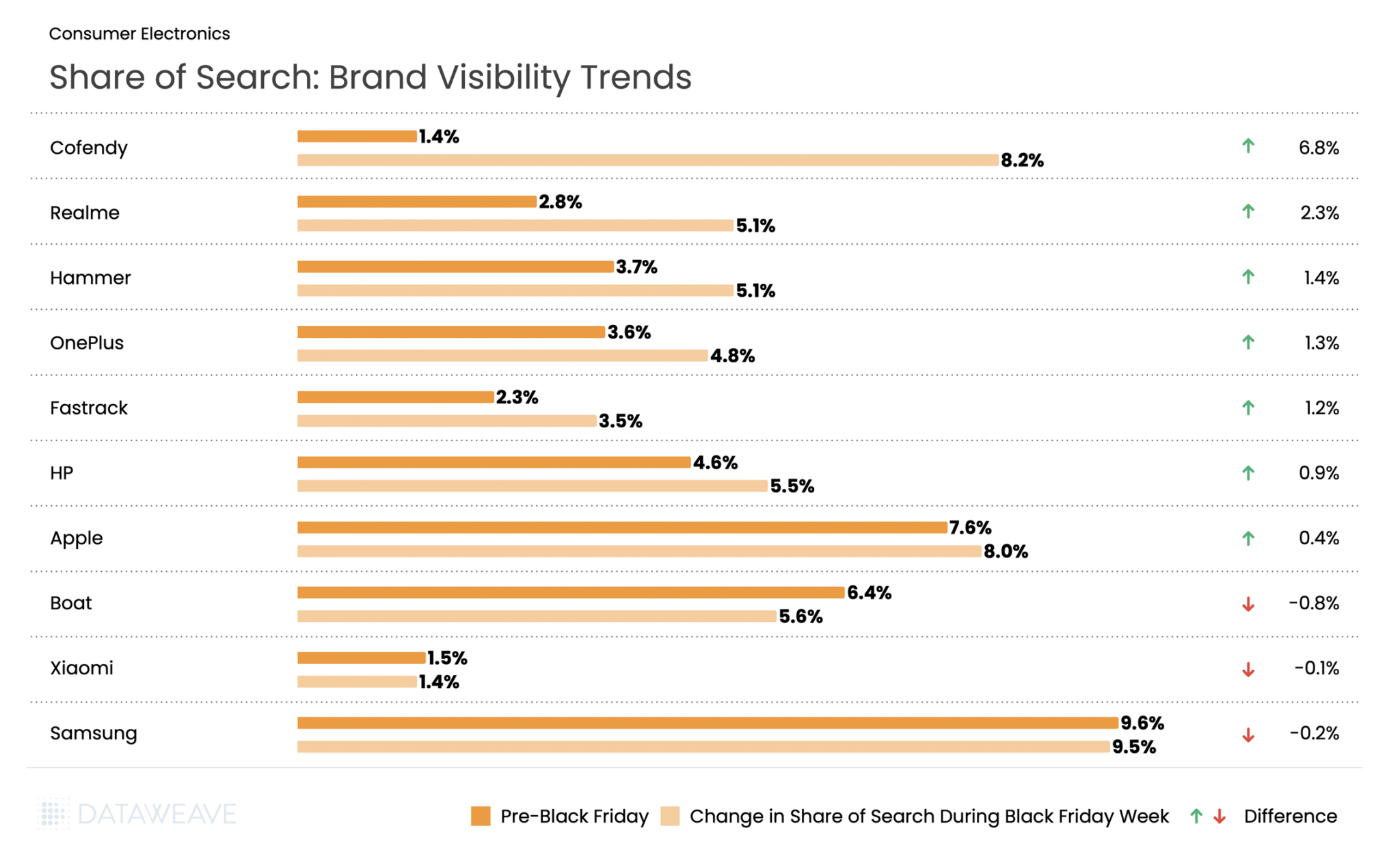 The most notable is Cofendy, electronics accessories and speaker brand, that saw the share of search rise from 1.4% pre Black Friday to 8.2% during the event. Realme followed with a solid 2.3% gain, reinforcing its position as a rising smartphone brand. Smart gadget brand Hammer also saw visibility increase by 1.4% at par with OnePlus, Fastrack, HP and Asus.