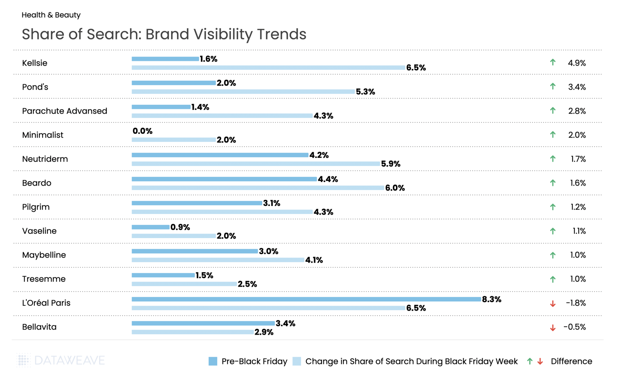 Affordable and emerging beauty brands dominated during Black Friday in India. Kellsie (beauty tools brand) surged from 1.6% to 6.5%. Classic mass-market brands like Pond’s (+3.4%) and Parachute Advanced (+2.8%) also performed strongly, alongside men’s grooming favorite Beardo (+1.6%). Other popular brands like Maybelline, Tresemme, Vaseline, all saw share of search and visibility increase during Black Friday.