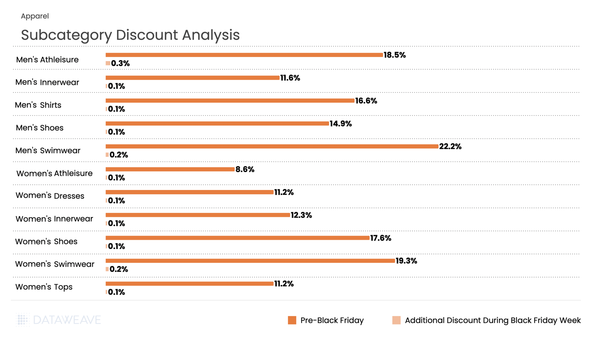 The category averaged 14.3% pre-Black Friday discounts with an additional 0.1% during Black Friday Week. Men’s Swimwear and Men’s Athleisure led pre-sale promotions at 22.2% and 18.5% respectively, while Women’s Swimwear and Women’s Shoes also saw strong pre event discounts at 19.3% and 17.6%.
