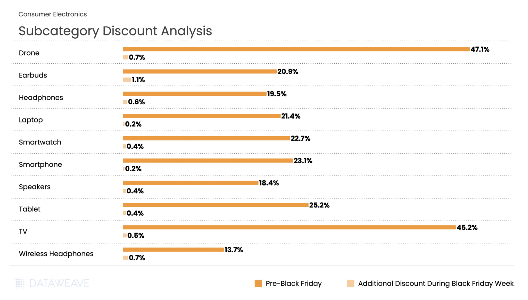 The category averaged 23.2% pre-Black Friday discounts with an additional 0.5% during Black Friday Week. Drones and TVs led pre-sale discounting at 47.1% and 45.2% respectively, suggesting retailers wanted to clear high-ticket inventory ahead of the main event. Tablets (25.2%) also saw aggressive pre-sale pricing. During Black Friday Week, Earbuds saw the most substantial additional discounts at 1.1%, while categories like Laptops and Smartphones, already heavily discounted, had minimal incremental price cuts at 0.2%.