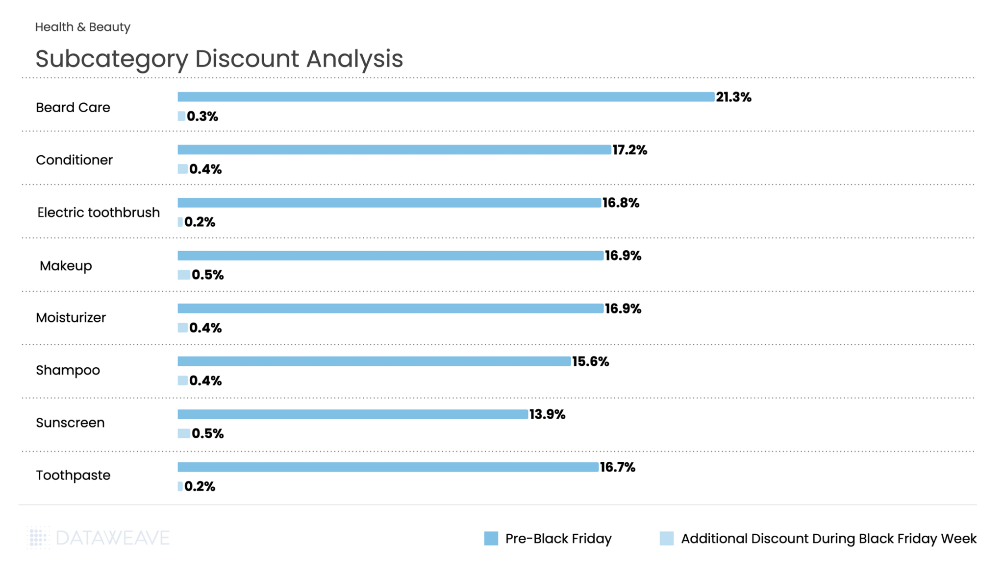 The category averaged 17% pre-Black Friday discounts with an additional 0.4% during Black Friday Week. Beard Care led early discounting at 21.3%, reflecting strong pre-sale positioning in men’s grooming. Conditioner (17.2%), Makeup (16.9%), and Moisturizer (16.9%) also saw solid baseline promotions. During Black Friday Week, Makeup and Sunscreen saw the highest additional discounts at 0.5% each, while Electric Toothbrush and Toothpaste maintained modest incremental discounts at 0.2%.