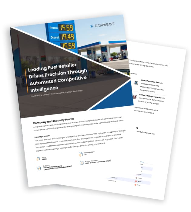 A leading fuel retailer partnered with DataWeave to automate competitive fuel price intelligence across 850 locations, replacing manual surveys with high-frequency, accurate data to improve pricing precision and operational efficiency.